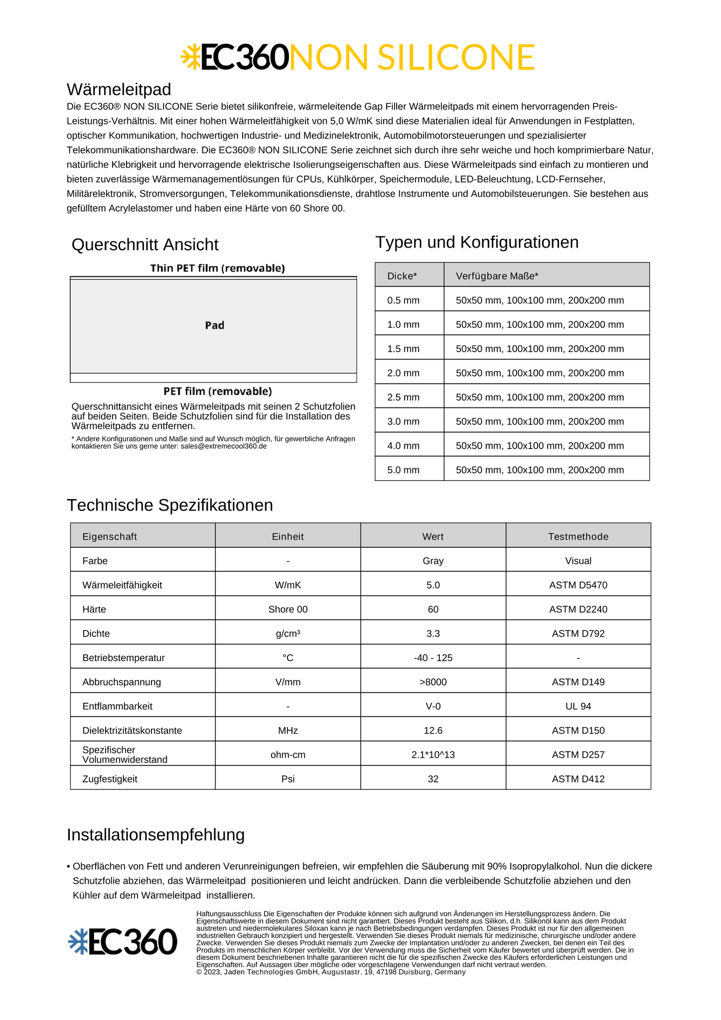 Die EC360® NON SILICONE Serie bietet silikonfreie, wärmeleitende Gap Filler Wärmeleitpads mit einem hervorragenden Preis-Leistungs-Verhältnis. Mit einer hohen Wärmeleitfähigkeit von 5,0 W/mK sind diese Materialien ideal für Anwendungen in Festplatten, optischer Kommunikation, hochwertigen Industrie- und Medizinelektronik, Automobilmotorsteuerungen und spezialisierter Telekommunikationshardware. Die EC360® NON SILICONE Serie zeichnet sich durch ihre sehr weiche und hoch komprimierbare Natur, natürliche Klebrigkeit und hervorragende elektrische Isolierungseigenschaften aus. Diese Wärmeleitpads sind einfach zu montieren und bieten zuverlässige Wärmemanagementlösungen für CPUs, Kühlkörper, Speichermodule, LED-Beleuchtung, LCD-Fernseher, Militärelektronik, Stromversorgungen, Telekommunikationsdienste, drahtlose Instrumente und Automobilsteuerungen. Sie bestehen aus gefülltem Acrylelastomer und haben eine Härte von 60 Shore 00.